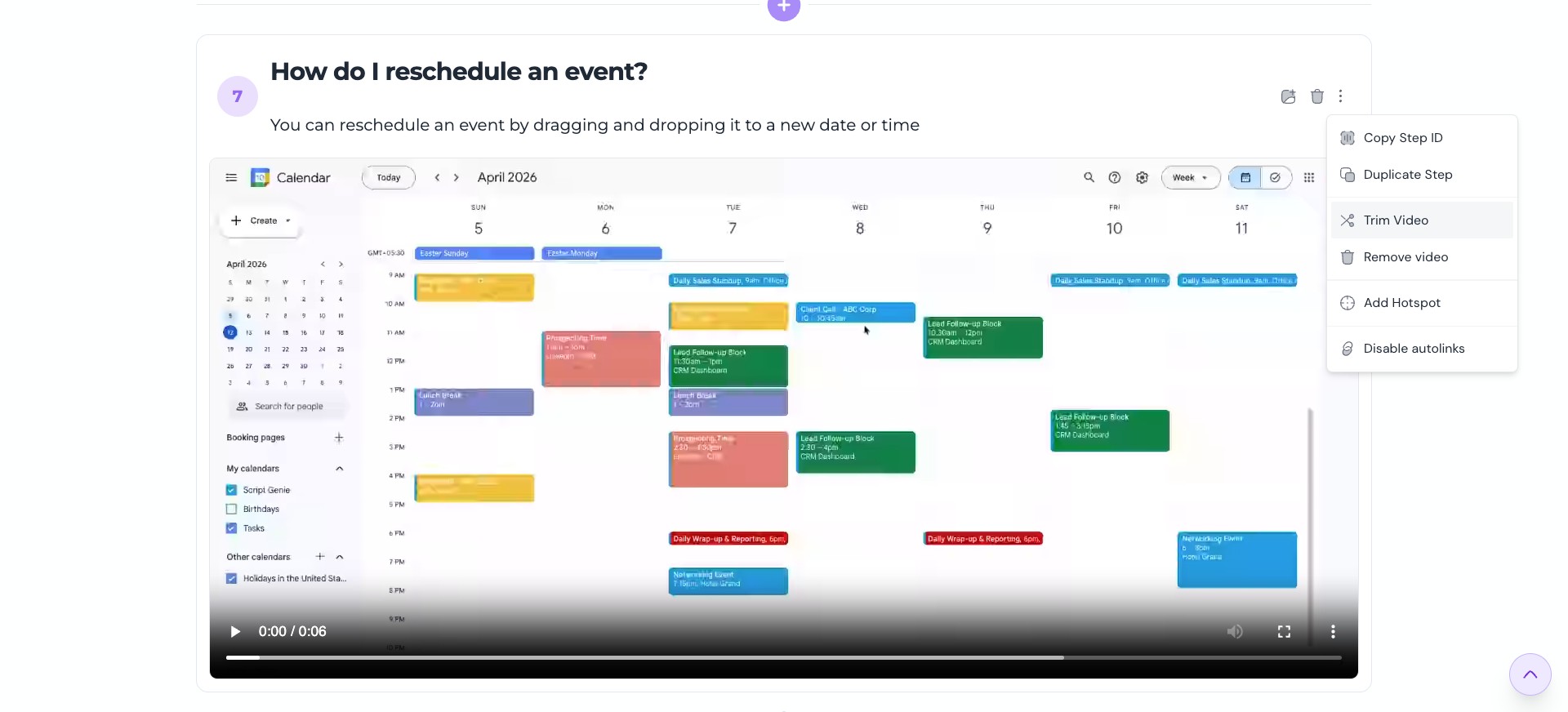 Open the guide editor and go to the step with the video you want to trim. Then click on More icon > Trim Video