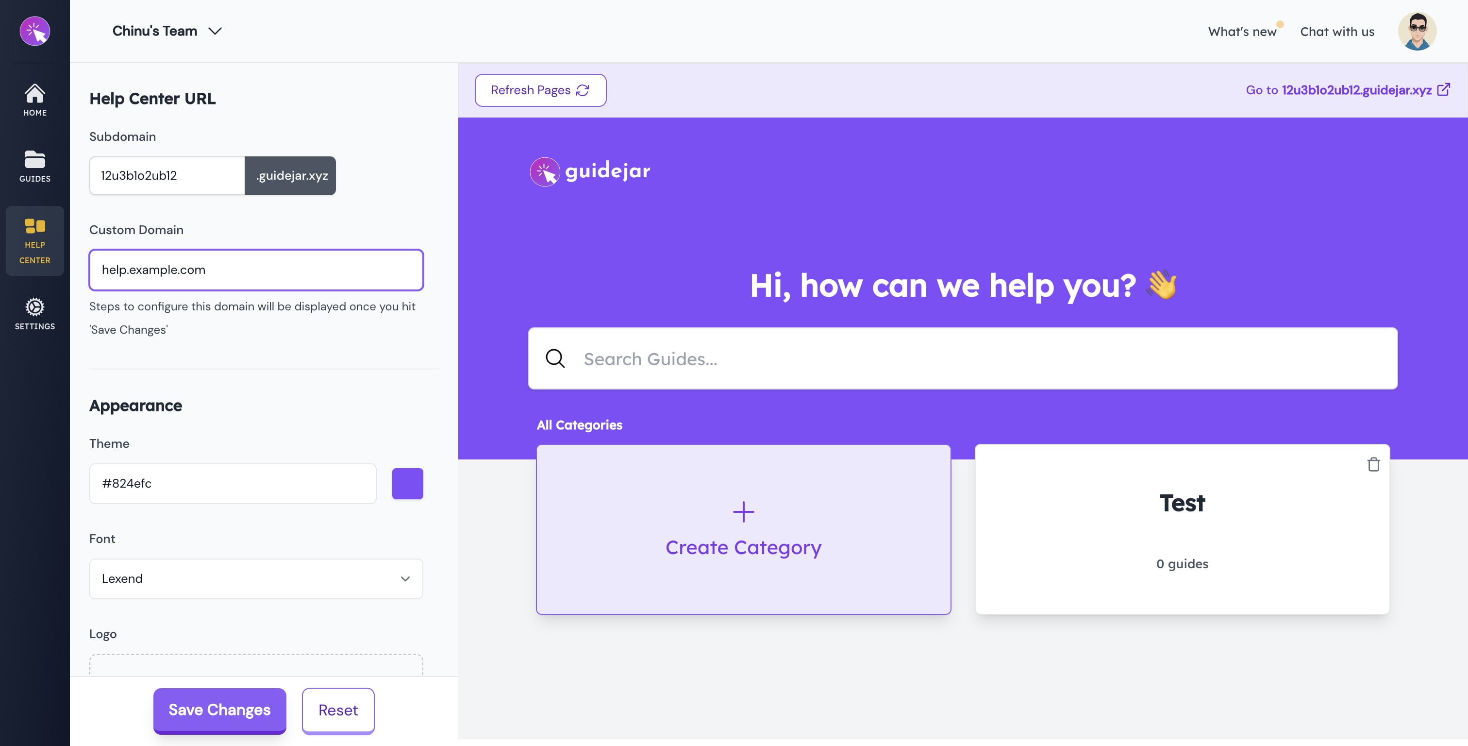 Setup your custom domain and serve all guides (must be publicly accessible and shared with your team) via your own domain. (It's not necessary to add the guides to the help center)